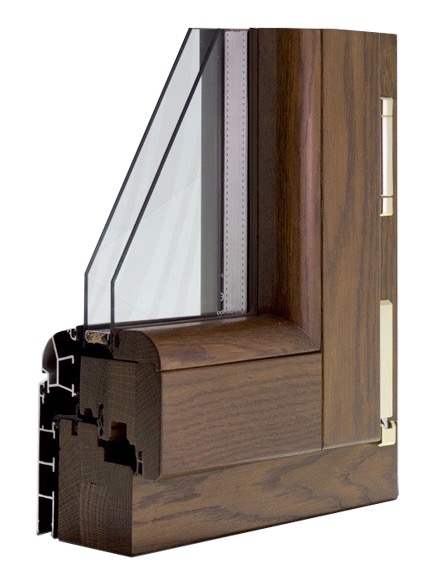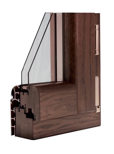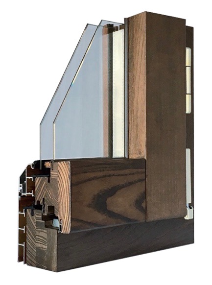 Struttura in legno/alluminio, Sezione del telaio 82×89 mm e Sezione dell’anta 102×81 mm, con quattro guarnizioni termoacustiche e ferramenta a nastro.