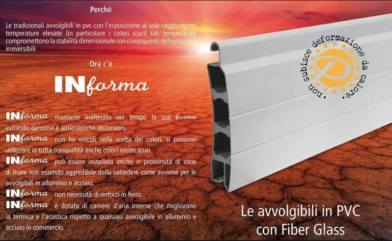 In FORMA è l avvolgibile in pvc RINFORZATO con fibra di vetro, per una maggiore stabilità nel tempo e la possibilità di realizzare anche tapparelle di larghezze più ampie dello standard. I vecchi avvolgibili in PVC di ultima generazione, non sono più robusti come quelli di una volta, perché il piombo che li rinforzava è stato vietato. Quindi sono sconsigliabili, anche se con rinforzi in ferro, perché esposti al sole, tendono a scaldarsi ed imbarcano con una certa semplicità .