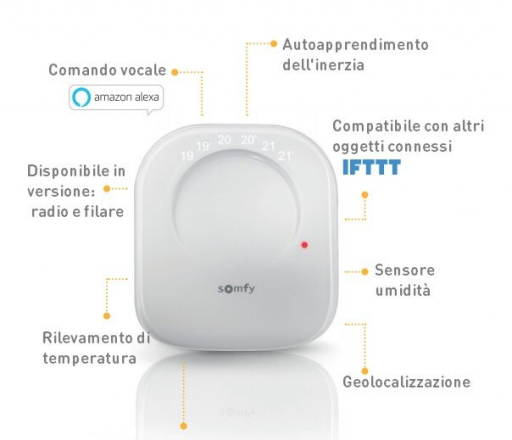 Il termostato connesso Somfy risponde ai requisiti della RT2012 per la misurazione del consumo energetico senza doverlo collegare ad una stazione di automazione domestica. Le 5 voci di spesa (riscaldamento, raffreddamento, acqua calda sanitaria, griglia elettrica, altri) vengono misurati o stimati. Monitoraggio e stima sono disponibili dall’applicazione mobile. Tempi di consegna: 3 giorni se disponibile, 7 giorni se non disponibile. Accessori compresi nel prezzo: Pile stilo. Scheda Tecnica: Download